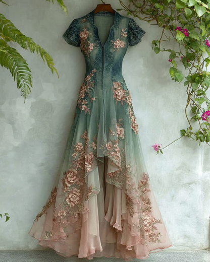 Women's Elegant Gradient Flowers Embroidery Irregular Ruffle Mesh Dress 9789